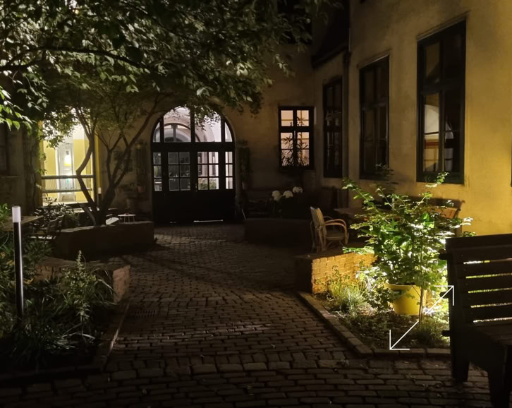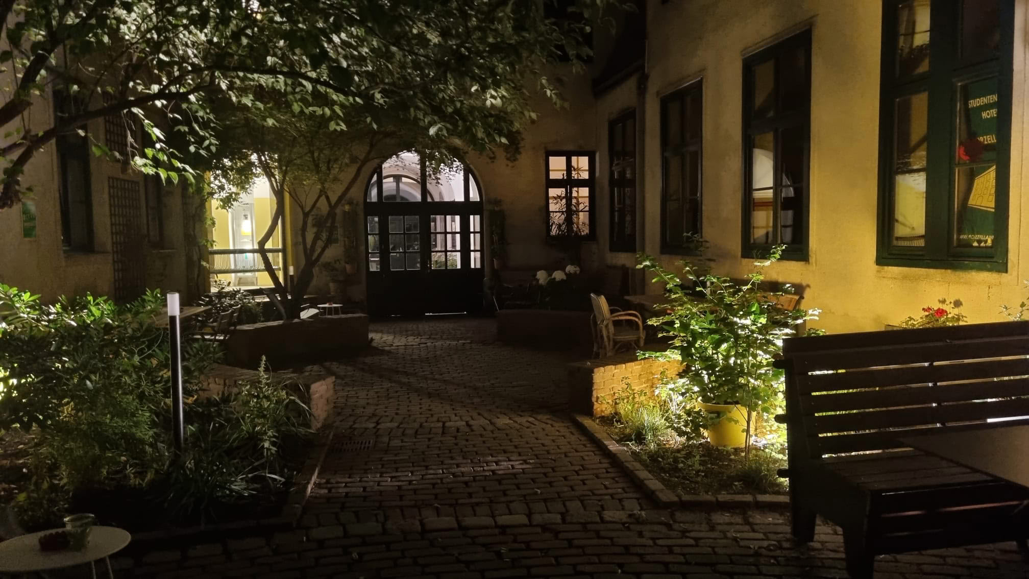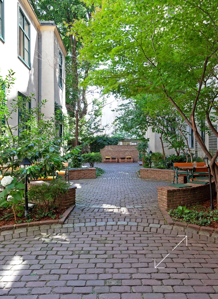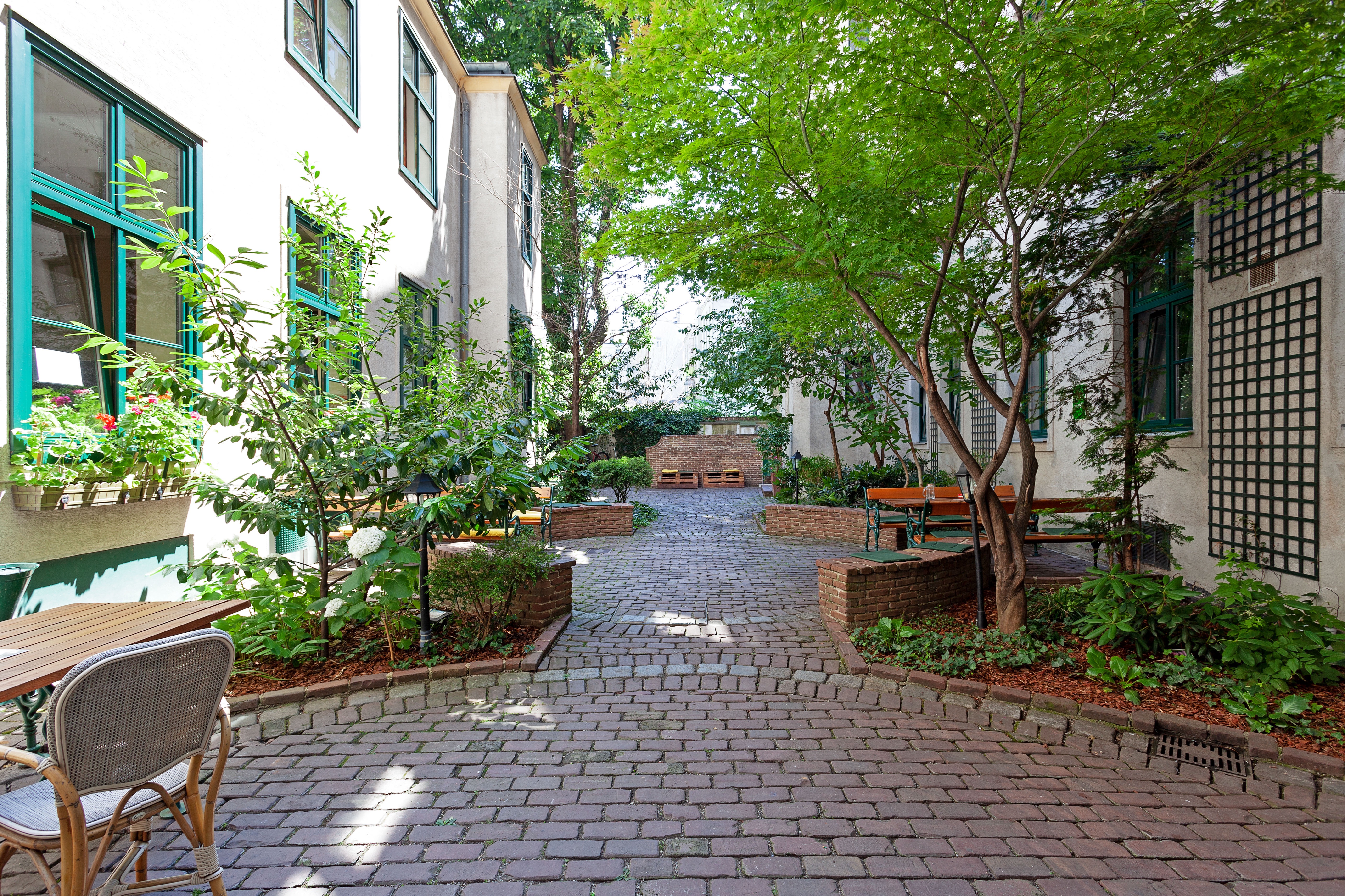 - begrünter Innenhof mit Tischen und Bänken
