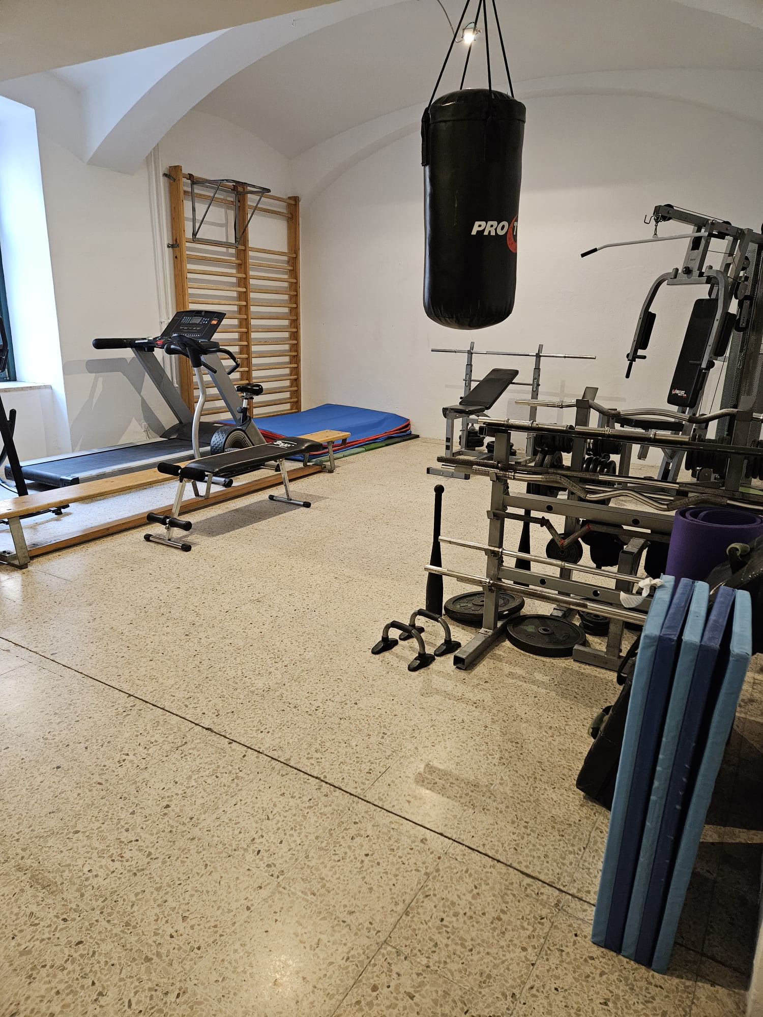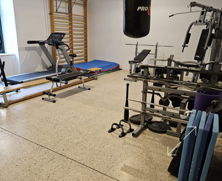 - Fitnessraum mit Hanteln, Laufband, Sprossenwand, Bänke. Medizinbälle